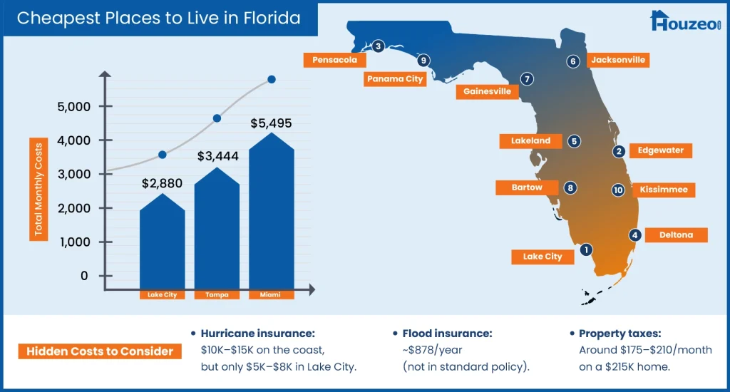 Even in the cheapest Florida cities to live in, home prices are only part of the cost. After hurricanes Helene and Milton, insurance premiums rose sharply. So, factor in hurricane and flood coverage along with property taxes when looking for the cheapest area to live in Florida.