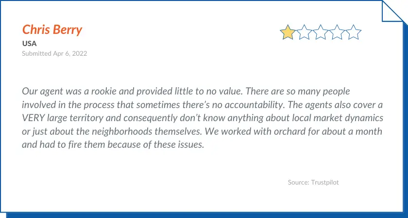 It couldn’t have been clearer that Orchard didn’t care about my home sale. I was never certain that my auto assigned agent had my best interest at heart. He would never explain anything, was unresponsive, and generally abrasive when he actually did respond. Once we were under contract it literally took him a week to respond to any question or request for a status update.