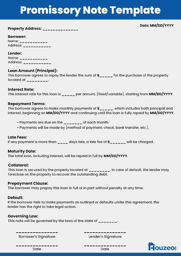 - Default and Legal Remedies: If the borrower fails to meet the repayment terms, the promissory note grants the lender the right to take legal action. This could lead to foreclosure on the property to recover the loan.